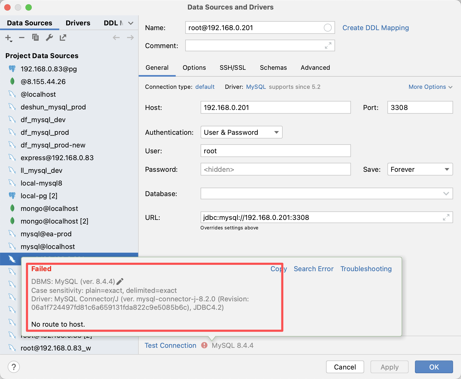 使用idea datagrid 访问MySQL数据库,提示 15.4.1 No route to host.